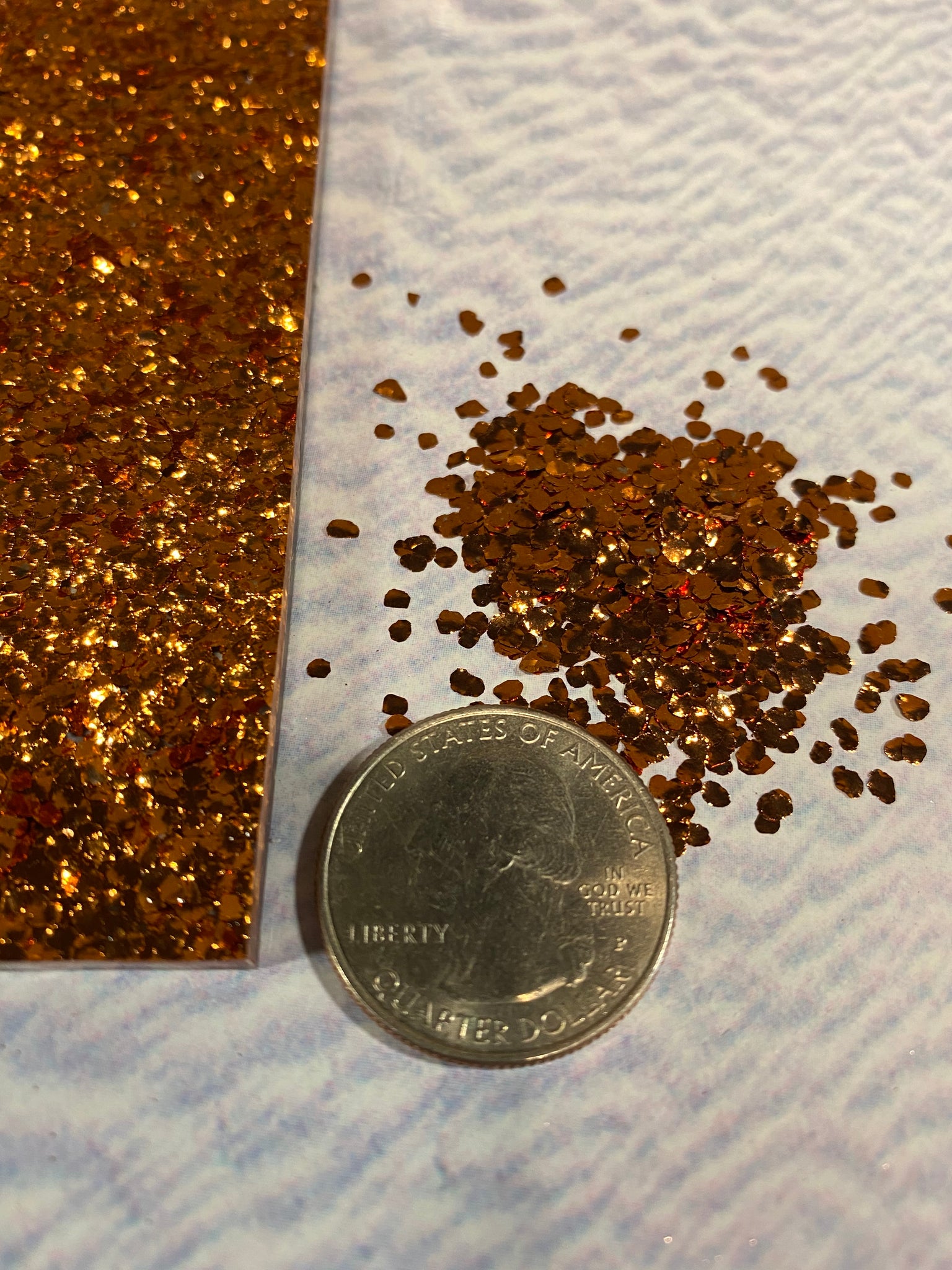 15 grams of highly polished amber copper metal flakes. The color of these metal flakes is a rich shade of burnt orange.