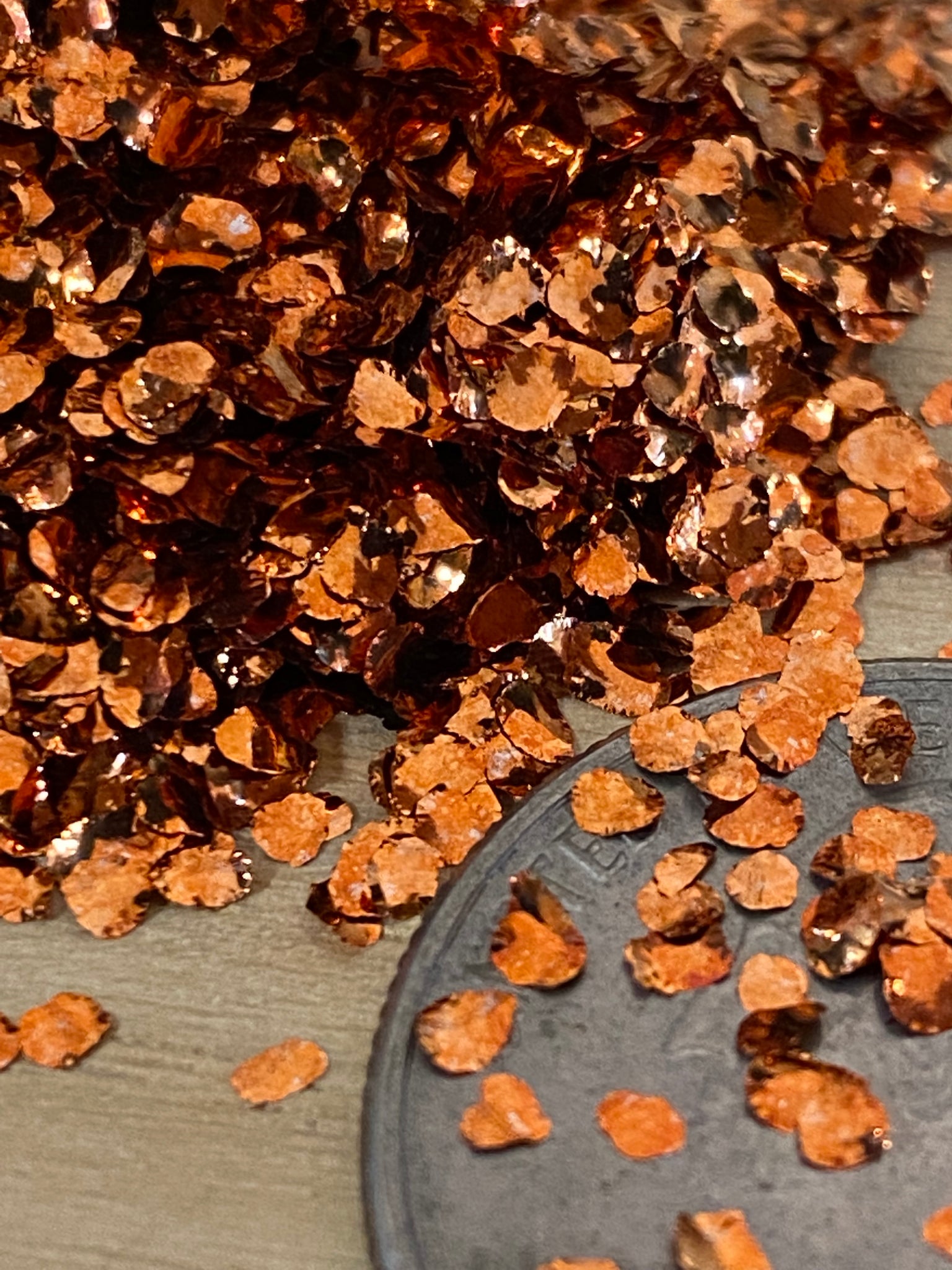 Genuine burnt copper metal flakes that have a slight curl to them, giving them a three dimensional appearance. When embedded in resin they reflect light at all different angles.