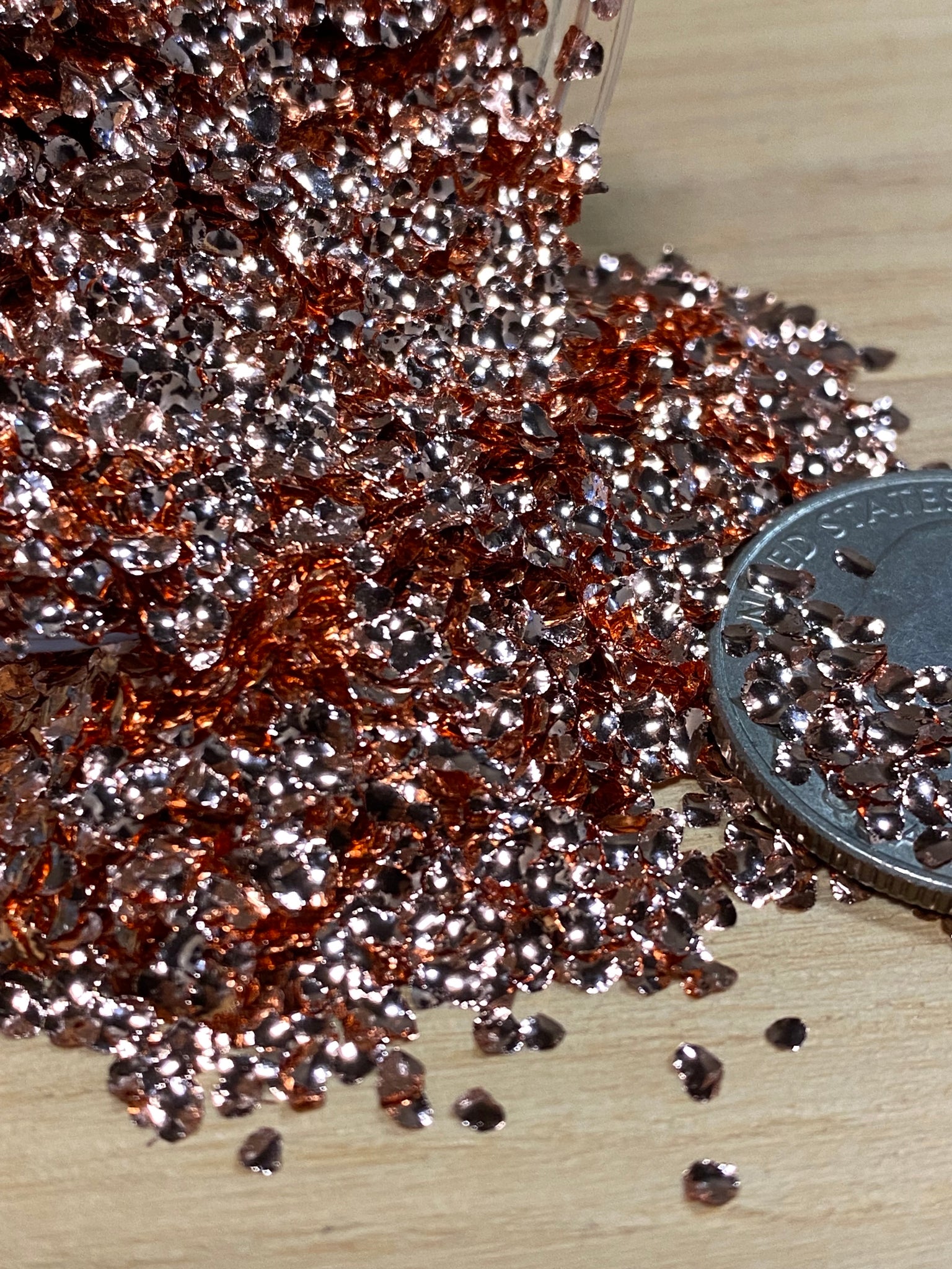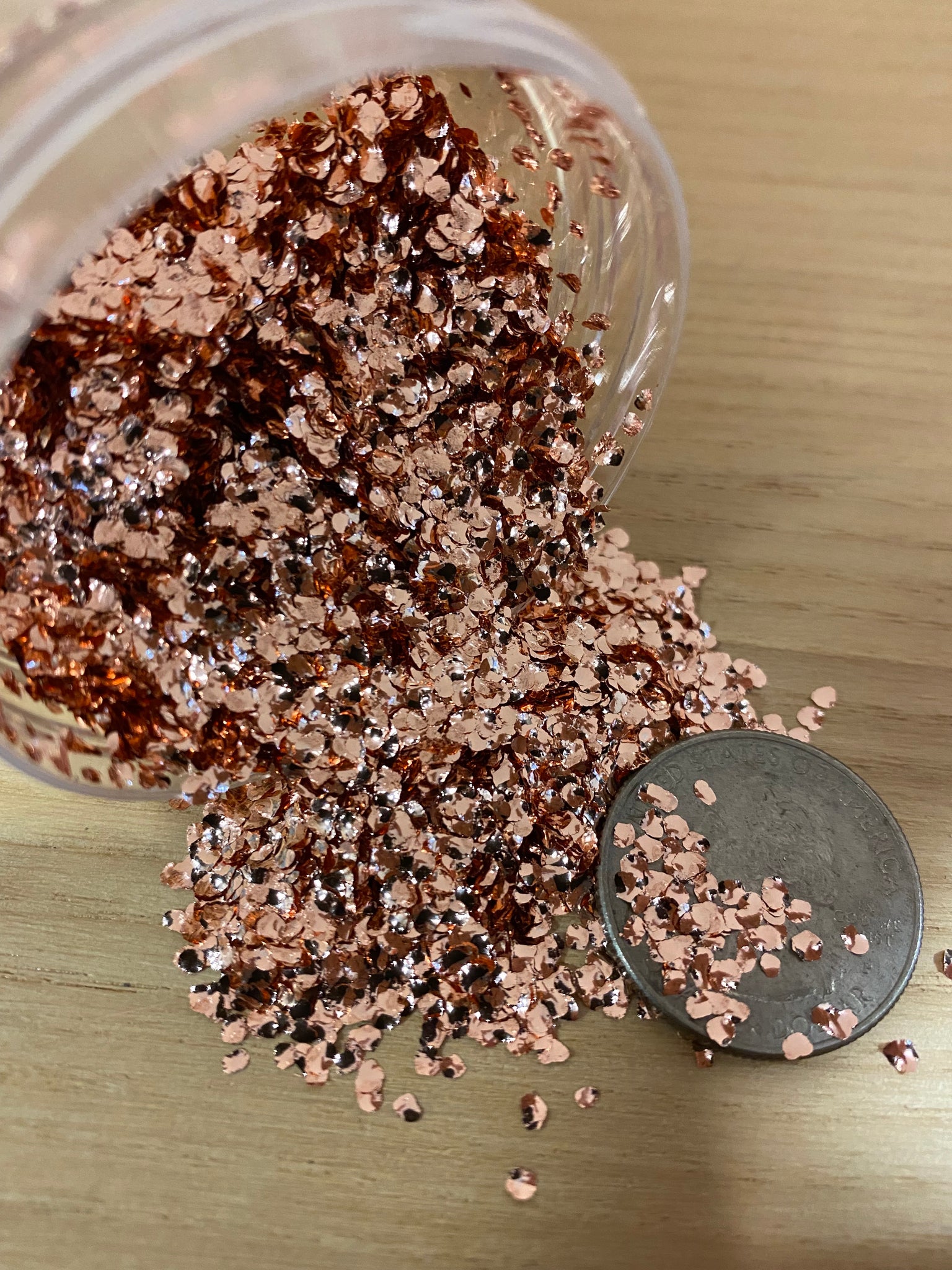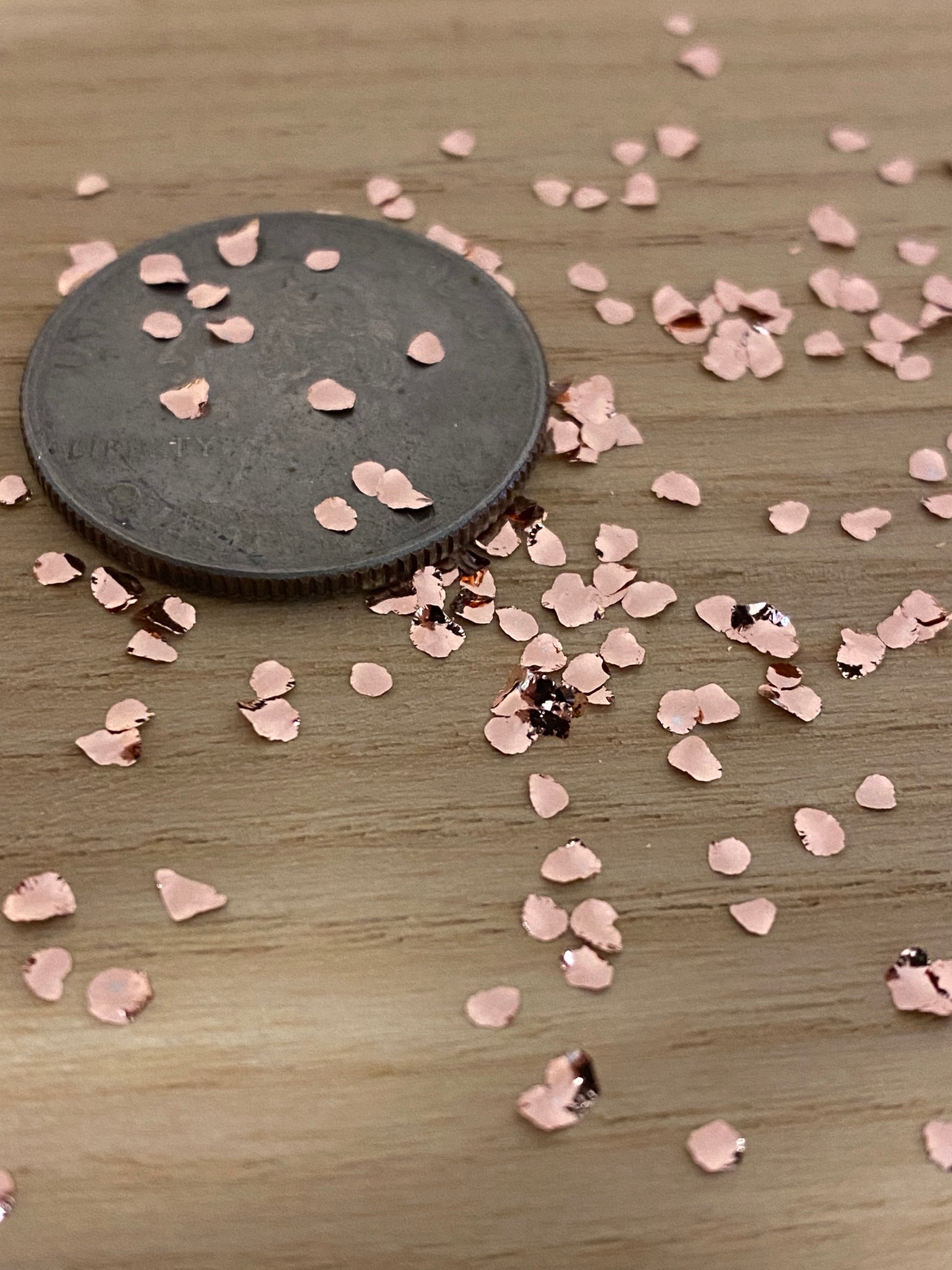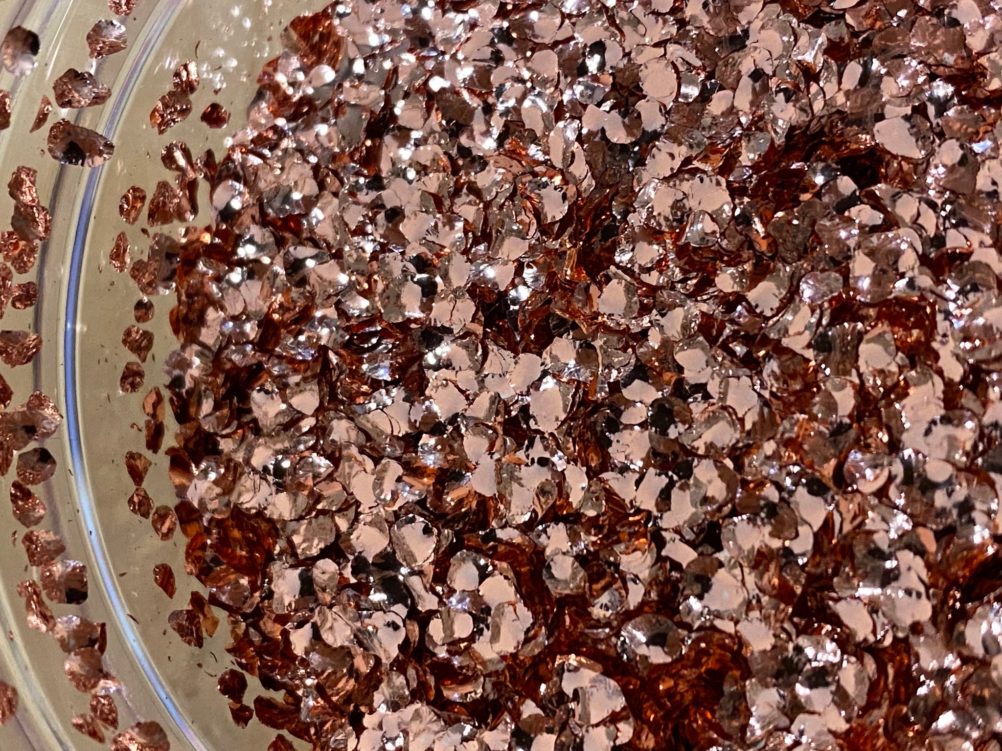 These genuine copper flakes have a slight curl to them, giving them a three dimensional appearance. When embedded in resin that reflect light at all different angles.