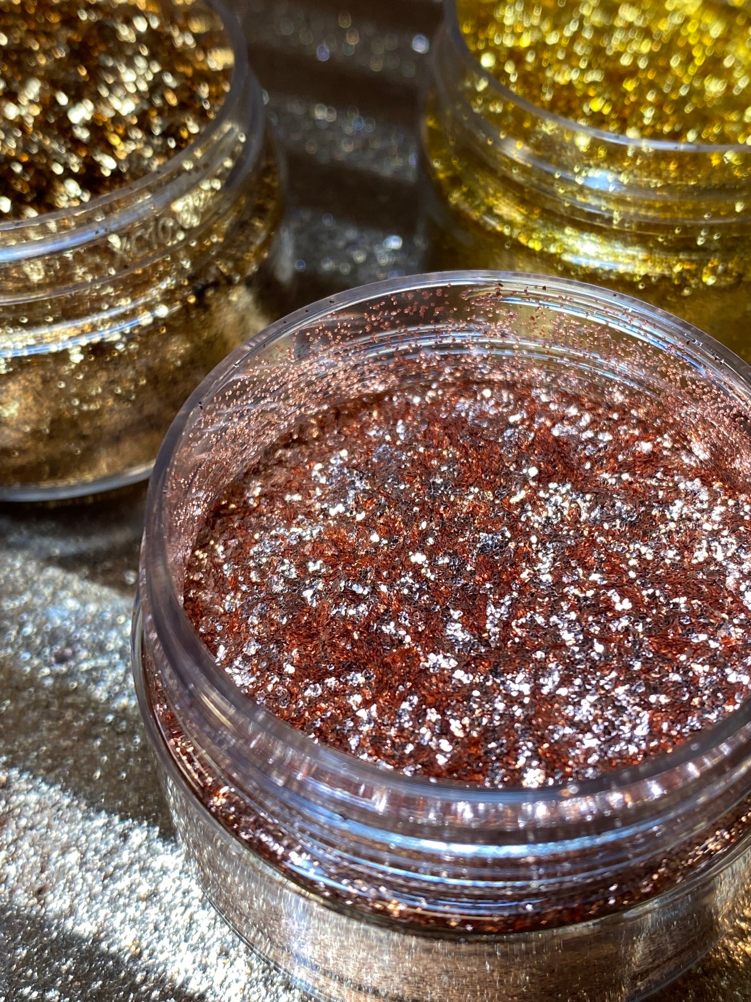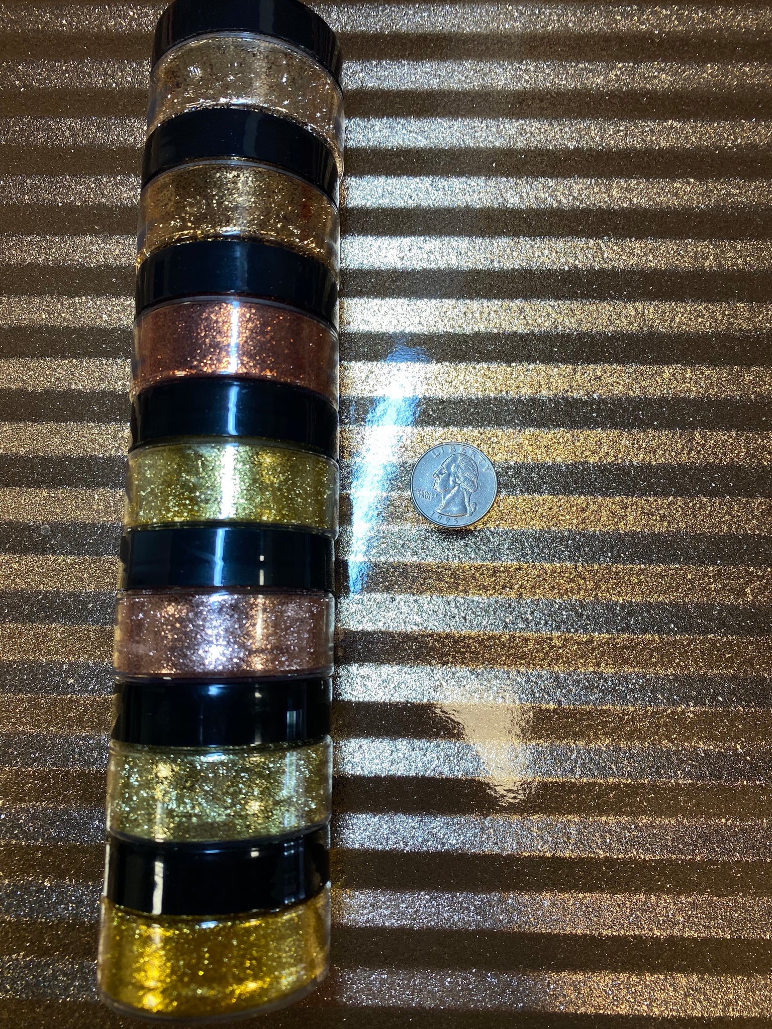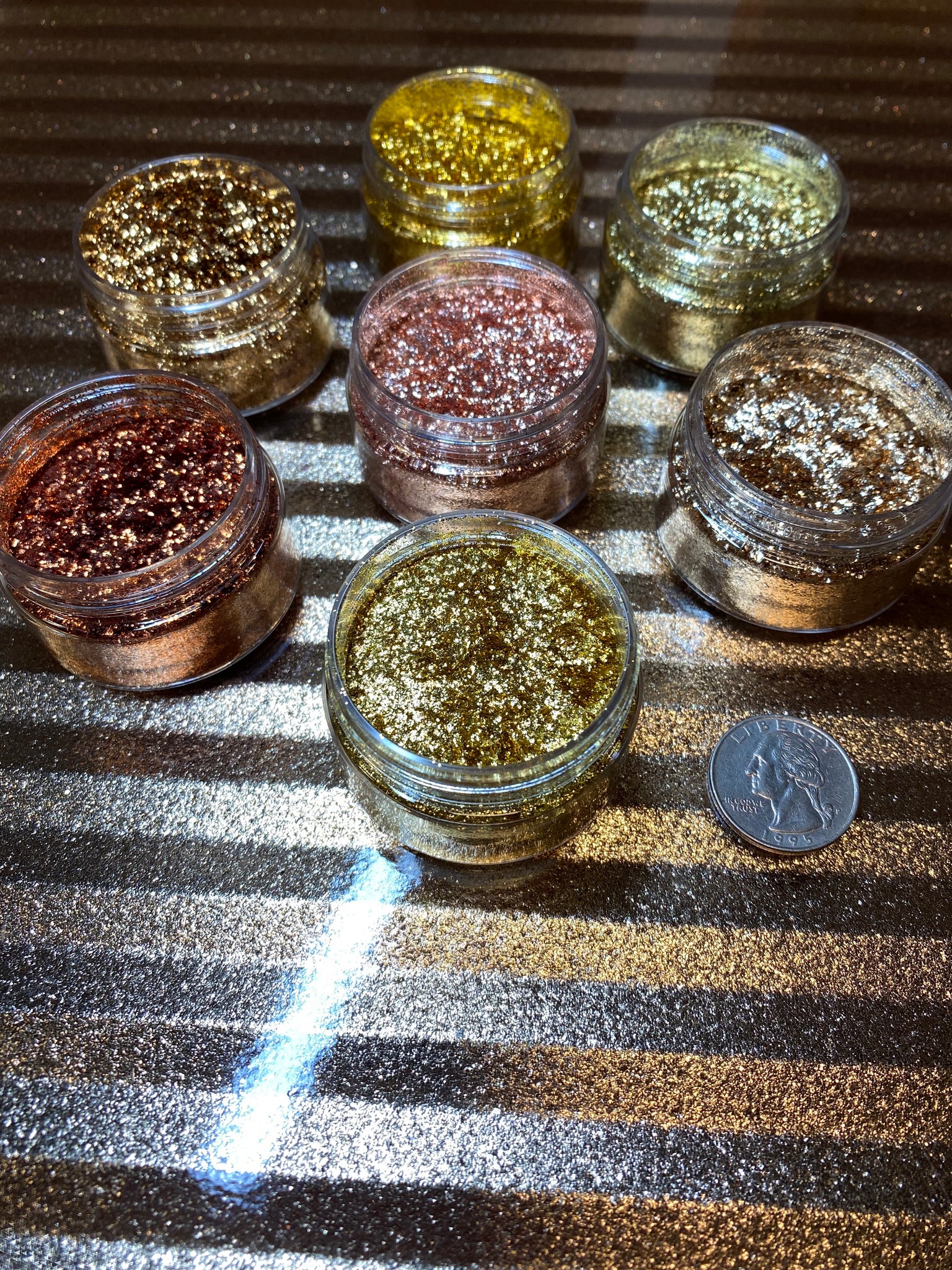 Seven of our fine flakes: copper, gold brass, amber copper, gold bronze, ultra gold brass, brass, and yellow brass.