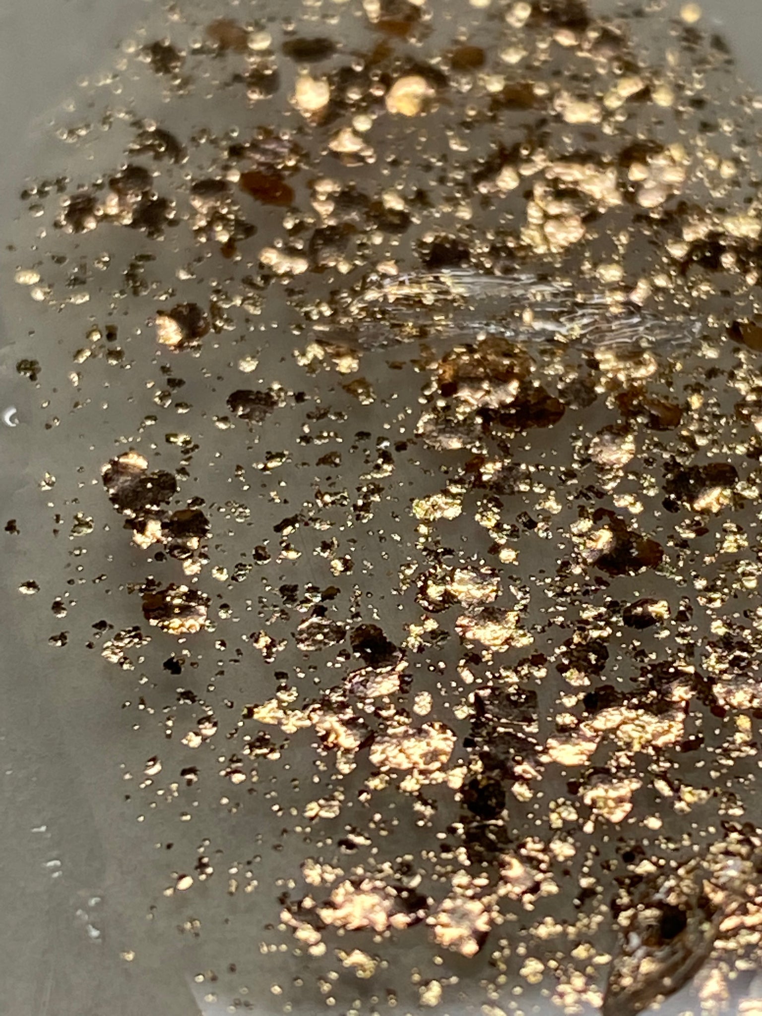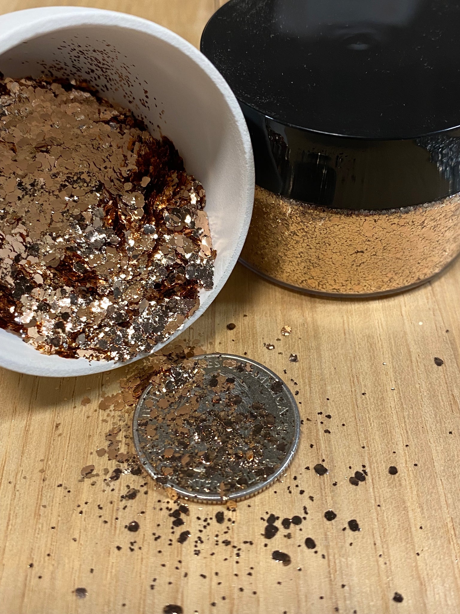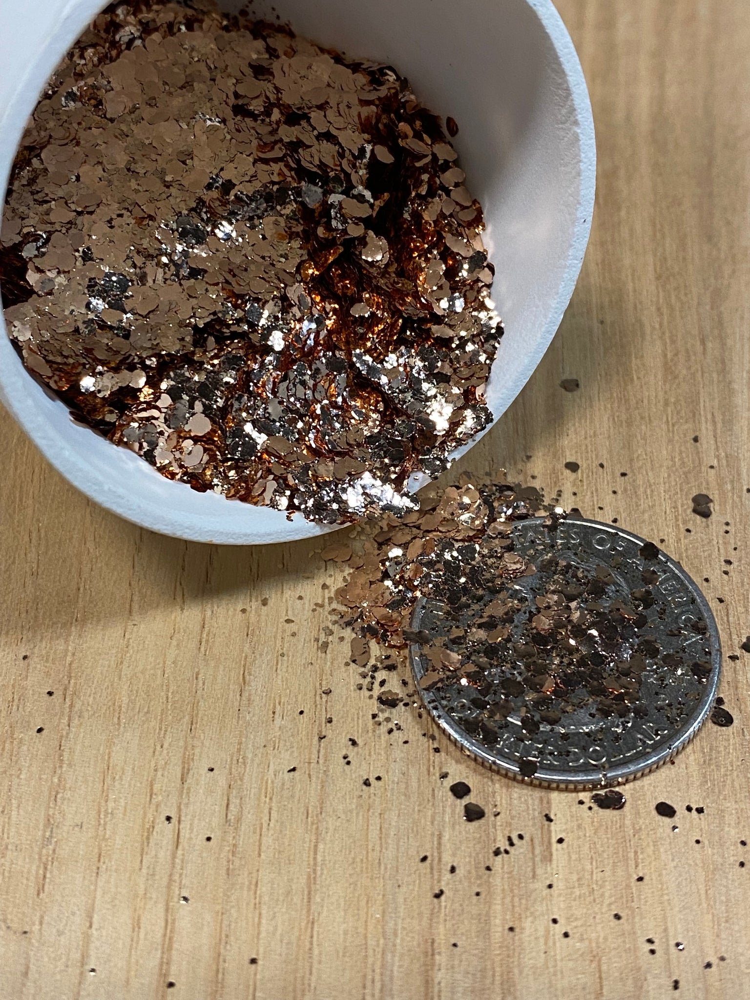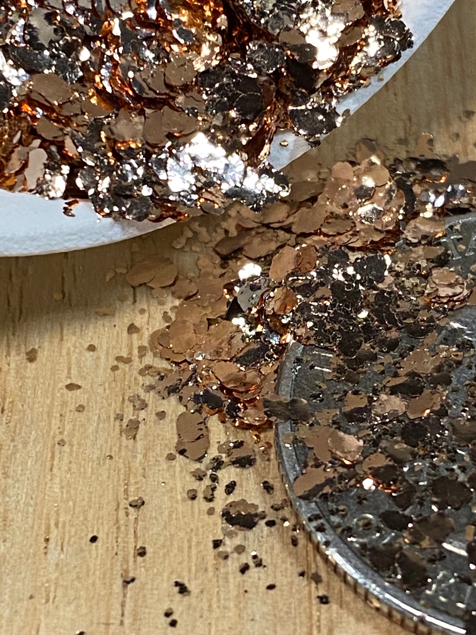 A blend of three sizes of our pure brass metal flakes. It includes our super fine .2mm flakes, .5mm and large 2mm flakes to create a stunning metallic brass effect.
