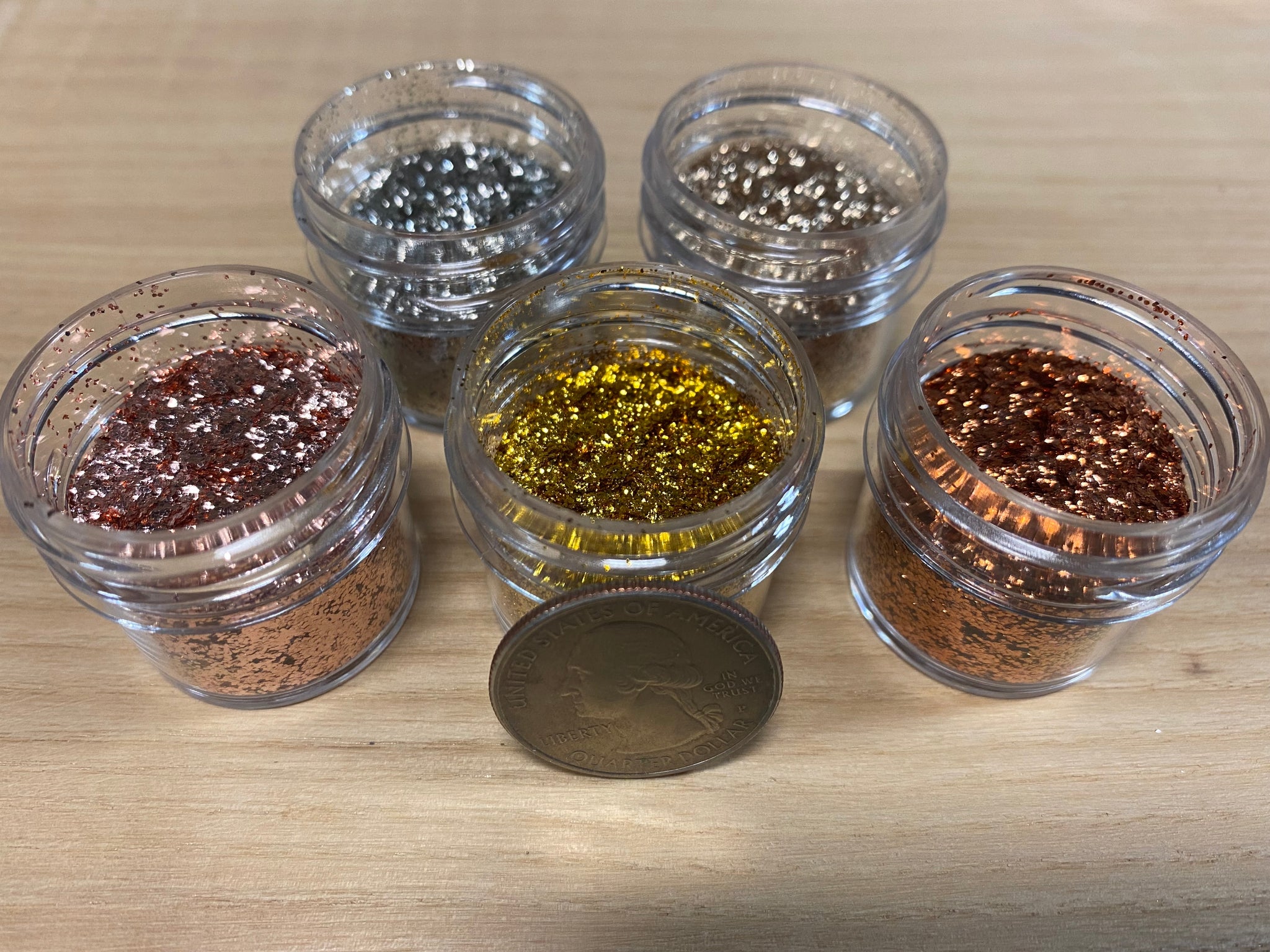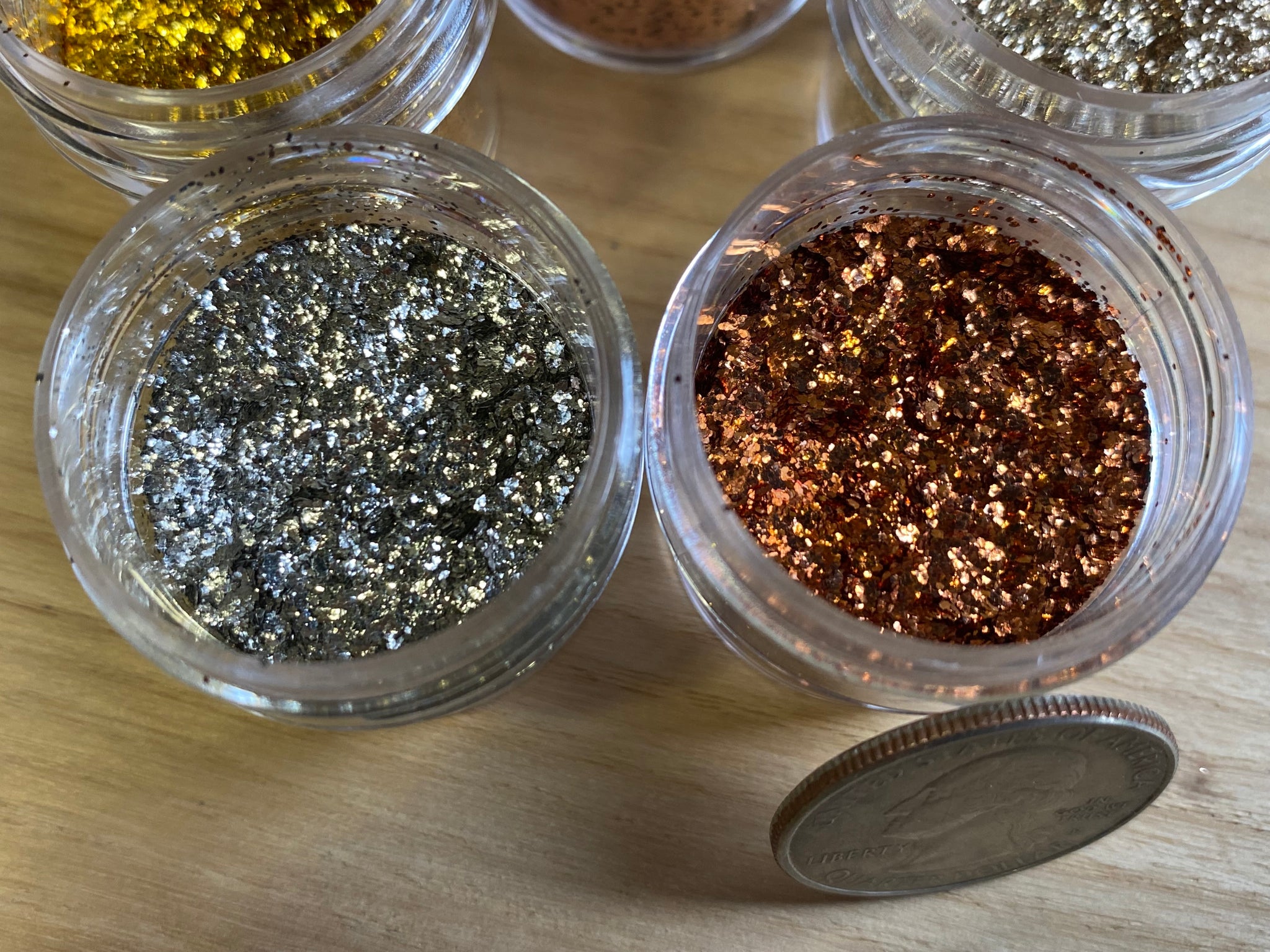 Five of our most popular mid-sized metal flakes. The metal flakes in this sample pack are copper, brass, gold bronze, ultra gold brass, and amber copper. They are approximately 1/2mm in diameter and made from 100% genuine metal.