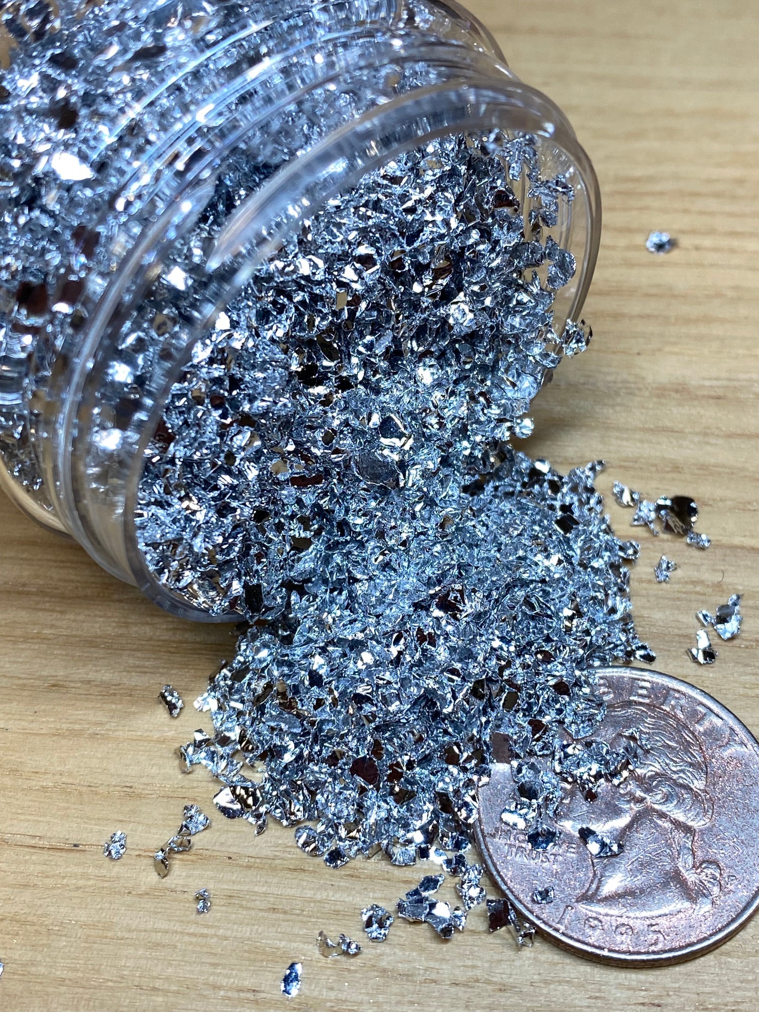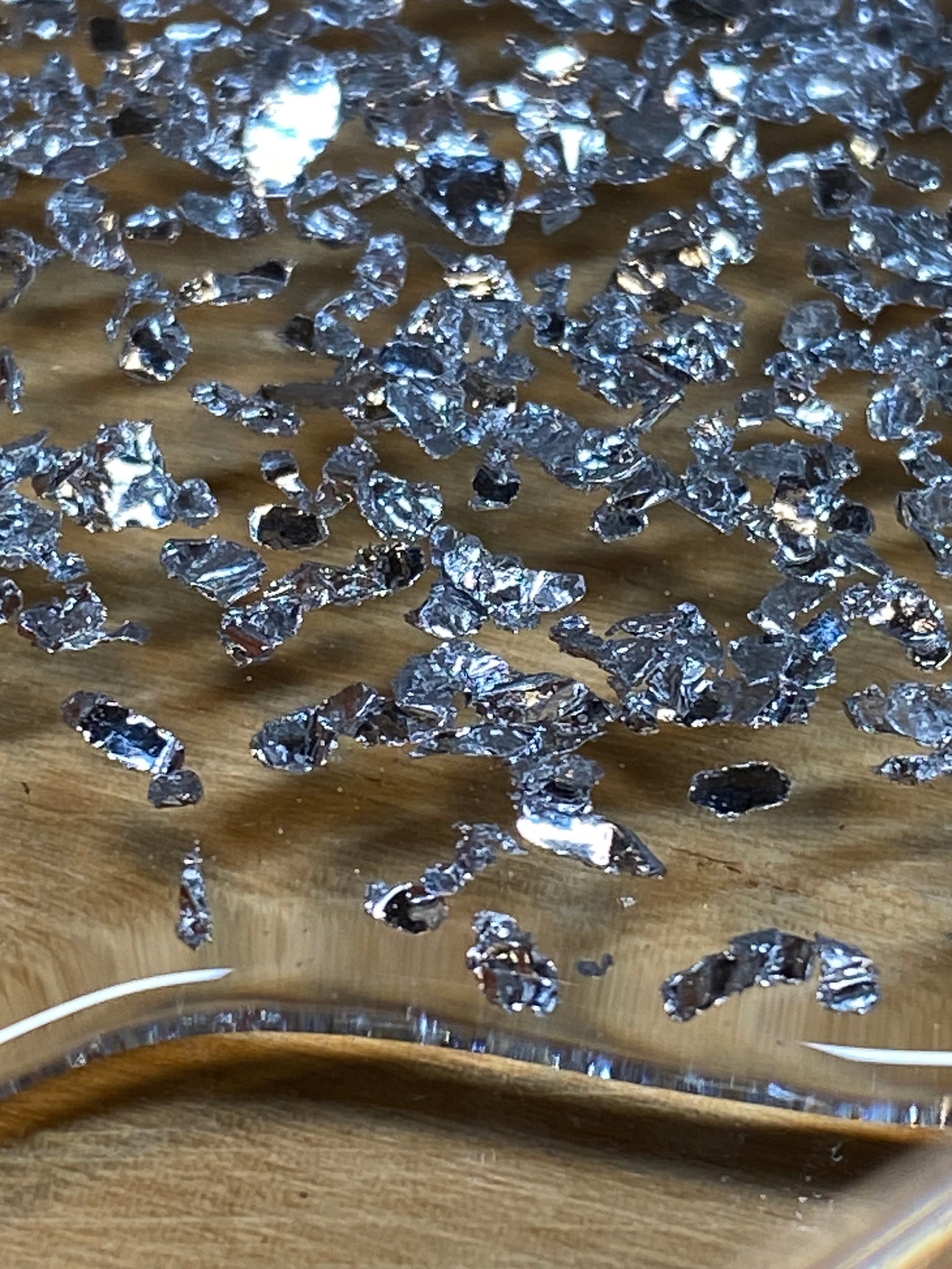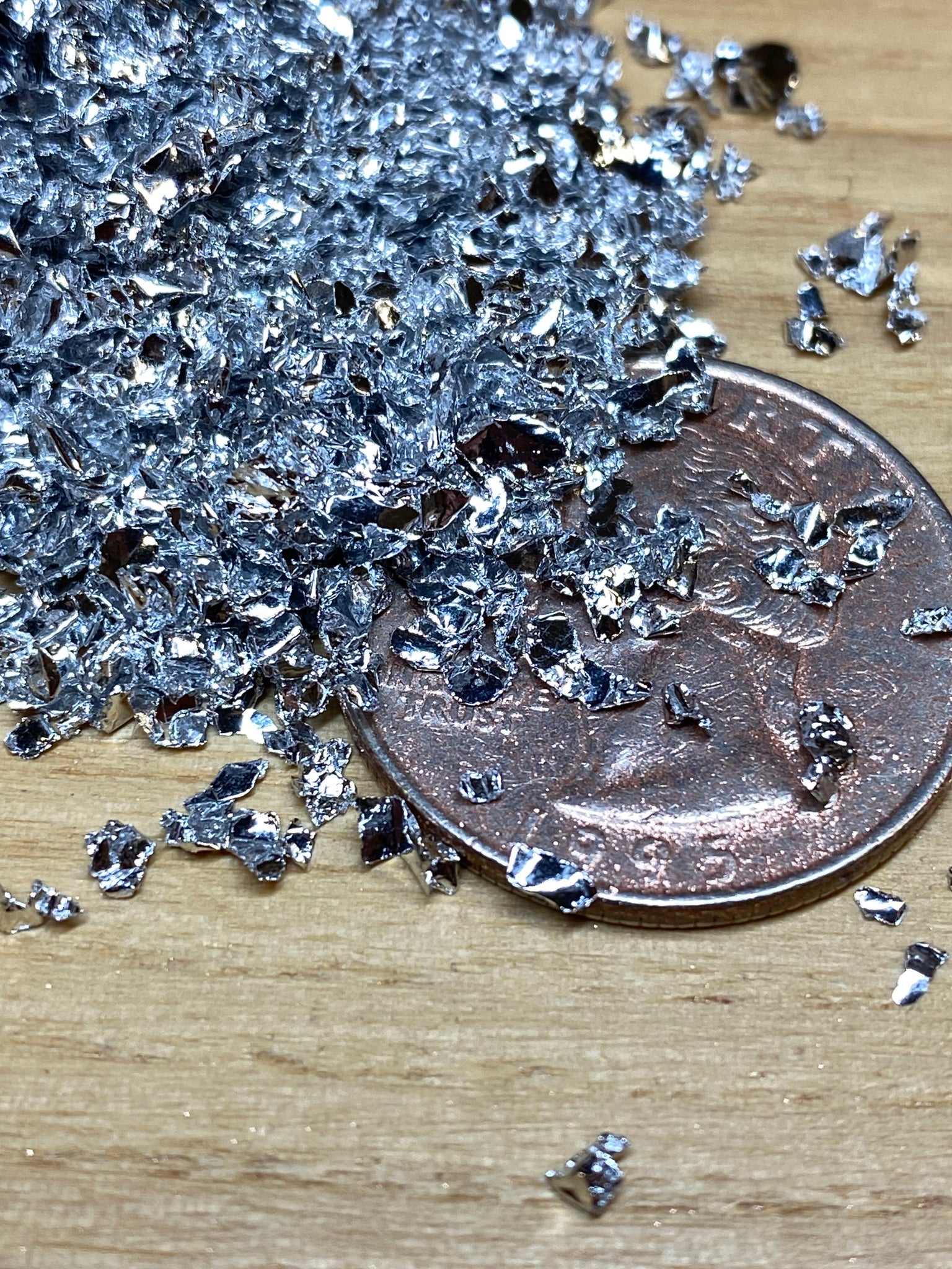 These aluminum flakes are approximately 3mm with sharp angles and bends in them to reflect light at all different angles. Great for deeper epoxy pours where a 3D metallic effect is needed.